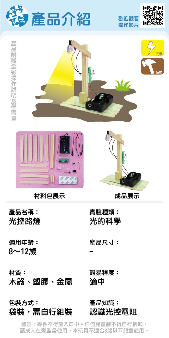 光控路燈 產品編號:KL002 原價 120 90 ✦ 知識目標 1. 認識路燈的起源與演變。 2. 了解光敏電阻的原理與應用。 ✦ 素養目標 1. 理解科學的進展與對人類社會的貢獻及限制。 2. 利用科學知識理解日常生活觀察到的現象。 課程建議時間:90分鐘 適用年齡:8-15歲 規格 組 -- 90元 數量 - + 加入購物車 立即結帳 上一筆 回到列表 下一筆
