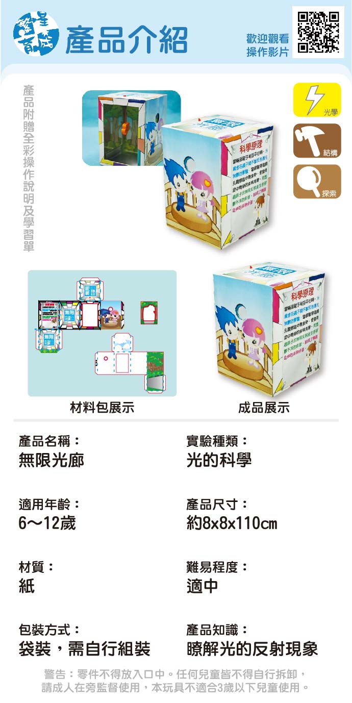 無限光廊 產品編號:K005-9 原價 100 75 ✦ 知識目標 1. 認識鏡子特性,了解光的反射現象。 2. 學會動手製作無限光廊。 ✦ 素養目標 1. 透過探討自然與物質世界的規律性,感受發現的樂趣。 2. 利用科學知識理解日常生活觀察到的現象。 課程建議時間:90分鐘 適用年齡:8-12歲 規格 組 -- 75元 數量 - + 加入購物車 立即結帳 上一筆 回到列表 下一筆