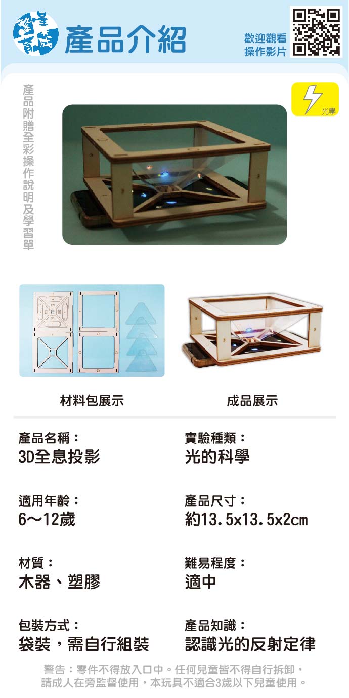 3D全息投影 產品編號:KS01123 原價 100 75 ✦ 知識目標 1. 認識全息投影技術。 2. 了解3D影像的生成原理。 ✦ 素養目標 1. 透過探討自然與物質世界的規律性,感受發現的樂趣。 2. 能簡單分辨或分類所觀察到的自然科學現象。 課程建議時間:90分鐘 適用年齡:6-12歲 規格 組 -- 75元 數量 - + 加入購物車 立即結帳 上一筆 回到列表 下一筆