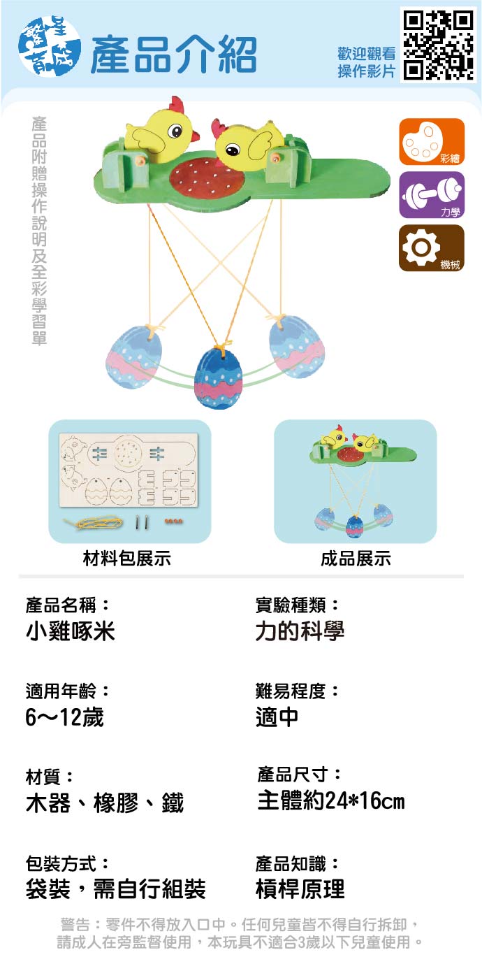 小雞啄米 產品編號:KS01109 原價 70 53 ✦ 知識目標 1. 認識槓桿原理。 2. 了解互動玩具的意義。 ✦ 素養目標 1. 能運用五官,敏銳的觀察周遭環境,保持好奇心、想像力持續探索自然。 2. 透過科學探索了解現象發生的原因或機制,滿足好奇心。 課程建議時間:90分鐘 適用年齡:8-12歲 規格 組 -- 53元 數量 - + 加入購物車 立即結帳 上一筆 回到列表 下一筆