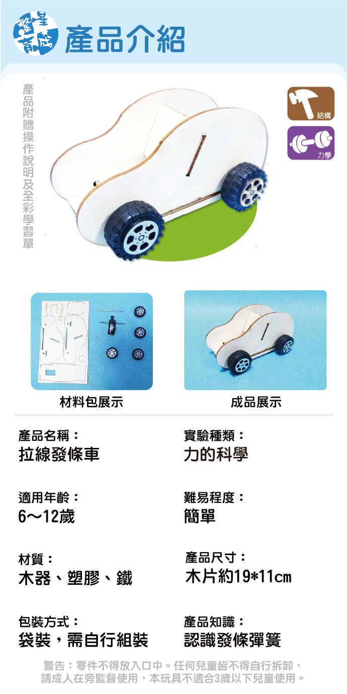 拉線發條車 產品編號:KS01207 原價 100 75 ✦ 知識目標 1. 認識什麼是彈力。 2. 了解發條也是一種提供動力的機械裝置。 ✦ 素養目標 1. 透過動手實作,享受以成品來表現自己構想的樂趣。 2. 利用科學知識理解日常生活觀察到的現象。 課程建議時間:90分鐘 適用年齡:6-12歲 規格 組 -- 75元 數量 - + 加入購物車 立即結帳 上一筆 回到列表 下一筆