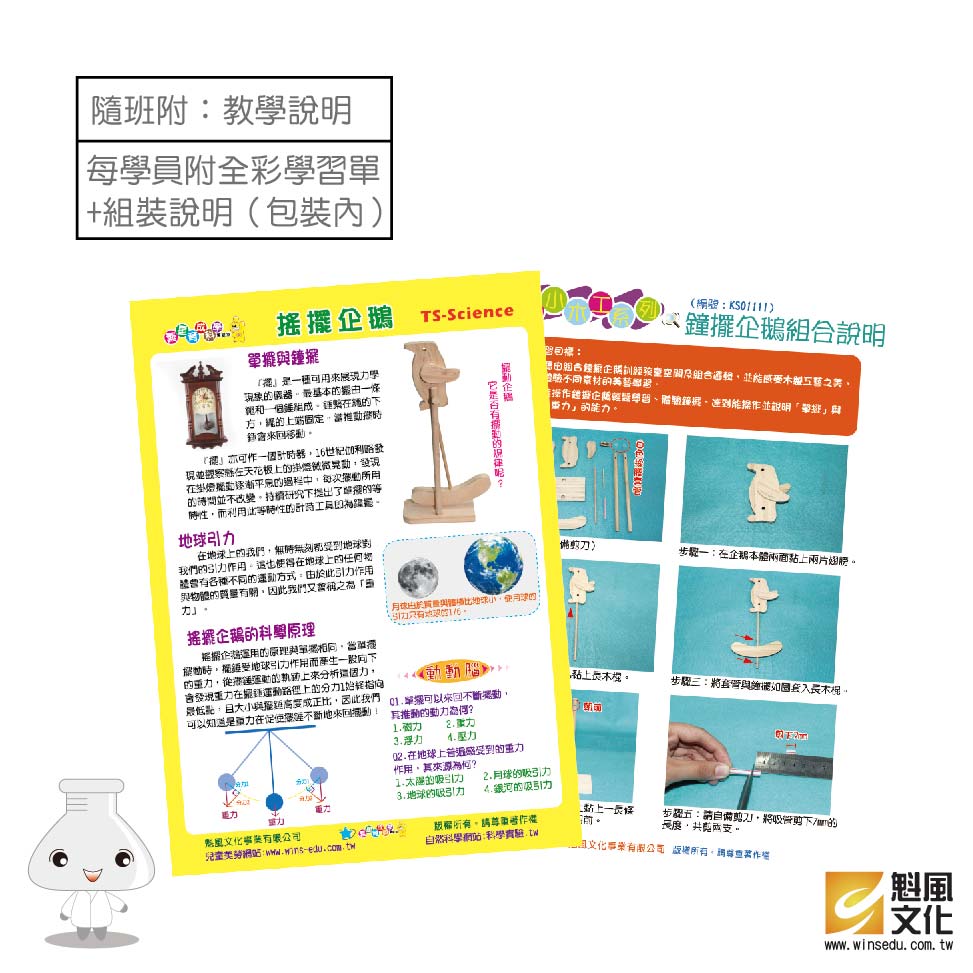 鐘擺企鵝 產品編號:KS01111 原價 90 68 ✦ 知識目標 1. 認識單擺與鐘擺。 2. 了解地球引力的作用。 ✦ 素養目標 1. 透過科學探索了解現象發生的原因或機制,滿足好奇心。 2. 透過動手實作,享受以成品來表現自己構想的樂趣。 課程建議時間:90分鐘 適用年齡:8-12歲 規格 組 -- 68元 數量 - + 加入購物車 立即結帳 上一筆 回到列表 下一筆