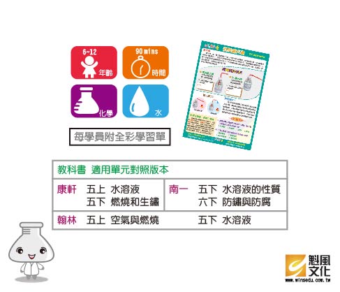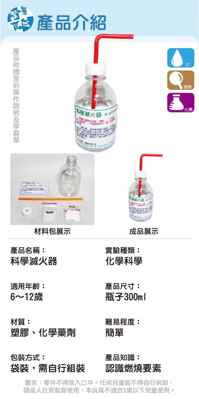 化學滅火器 產品編號:K004-30 原價 80 60 ✦ 知識目標 1. 認識滅火器的組成成分。 2. 了解燃燒三要素。 ✦ 素養目標 1. 透過科學探究活動解決一部分生活週遭的問題。 2. 利用科學知識理解日常生活觀察到的現象。 課程建議時間:90分鐘 適用年齡:6-12歲 規格 組 -- 60元 數量 - + 加入購物車 立即結帳 回到列表 下一筆
