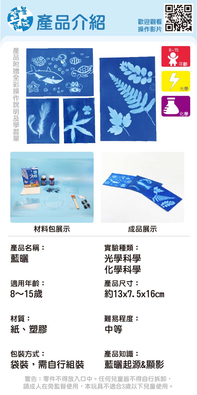 藍曬套裝 產品編號:K0016-7 原價 360 270 ✦ 知識目標 1. 認識藍曬原理和顯影原理。 ✦ 素養目標 1. 通過解決檢測過程中遇到的問題,培養學生解決問題的能力。 2. 透過科學探究活動,了解科學知識的基礎是來自於真實的經驗和證據。 課程建議時間:90分鐘 適用年齡:8-12歲 規格 盒 -- 270元 數量 - + 加入購物車 立即結帳 上一筆 回到列表