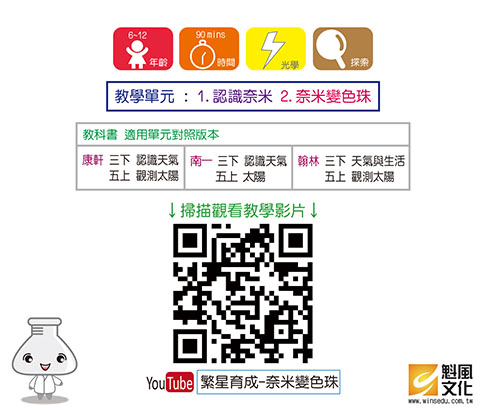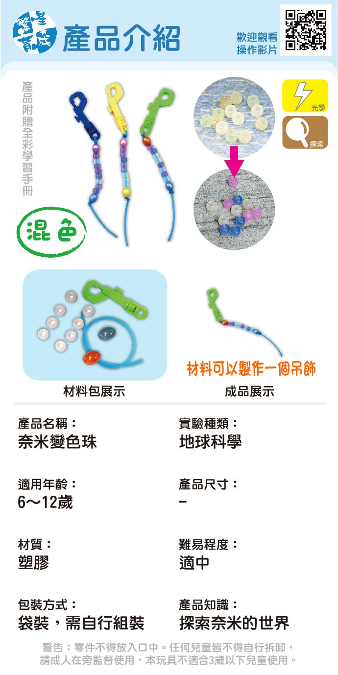 奈米變色珠 產品編號:K004-10 原價 80 60 ✦ 知識目標 1. 認識奈米並建立奈米大小概念。 2. 了解紫外線的特性。 ✦ 素養目標 能運用五官,敏銳的觀察周遭環境,保持好奇心、想像力持續探索自然。 課程建議時間:90分鐘 適用年齡:6-12歲 規格 組 -- 60元 數量 - + 加入購物車 立即結帳 上一筆 回到列表 下一筆