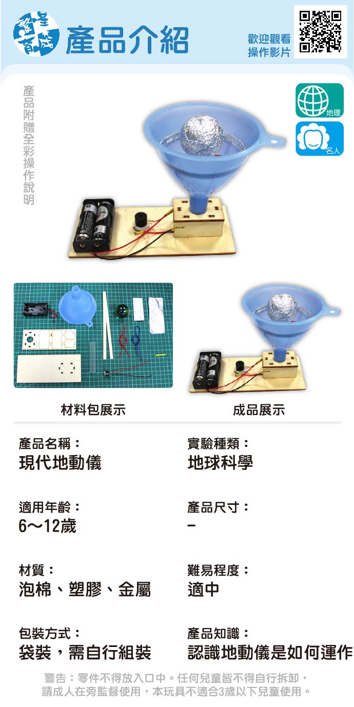 現代地動儀 產品編號:K005-20 原價 120 90 ✦ 知識目標 1. 認識地球的組成及地震發生的原因。 2. 了解地震對生活的影響。 ✦ 素養目標 透過科學探究活動解決一部分生活週遭的問題。 課程建議時間:90分鐘 適用年齡:6-12歲 規格 組 -- 90元 數量 - + 加入購物車 立即結帳 上一筆 回到列表 下一筆