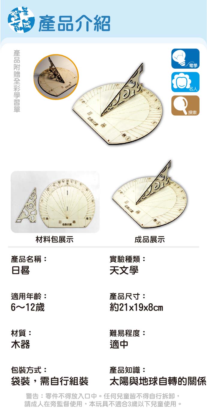 日晷 產品編號:K004-35 原價 100 75 ✦ 知識目標 1. 認識日晷的發明歷程。 2. 了解日晷的使用原理。 ✦ 素養目標 1. 透過科學探究活動,了解科學知識的基礎是來自於真實的經驗和證據。 2. 能簡單分辨或分類所觀察到的自然科學現象。 課程建議時間:90分鐘 適用年齡:8-12歲 規格 組 -- 75元 數量 - + 加入購物車 立即結帳 上一筆 回到列表 下一筆