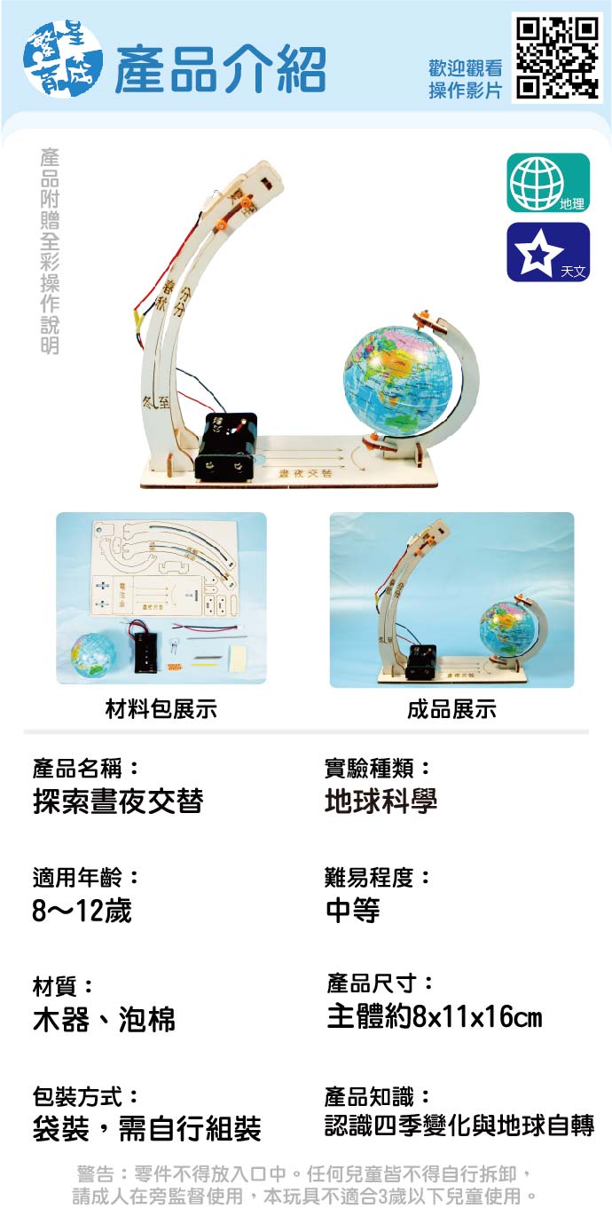 晝夜交替 產品編號:KS01238-1 原價 130 98 ✦ 知識目標 1. 認識地球的自轉與公轉。 2. 了解四季的形成原理。 ✦ 素養目標 1. 能將不同時間的現象加以比較,整理其變化。 2. 能簡單描述觀察到的變化,並連結自身經驗。 課程建議時間:90分鐘 適用年齡:8-12歲 規格 組 -- 98元 數量 - + 加入購物車 立即結帳 上一筆 回到列表 下一筆