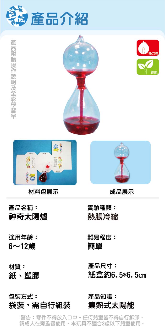 神奇太陽爐 產品編號:K005-1 原價 140 105 ✦ 知識目標 1. 認識太陽能量。 2. 了解熱漲冷縮原理。 ✦ 素養目標 1. 透過成功的科學探索經驗,感受自然科學學習的樂趣。 2. 透過各種感官了解生活週遭事物的屬性。 課程建議時間:90分鐘 適用年齡:8-12歲 規格 組 -- 105元 數量 - + 加入購物車 立即結帳 回到列表 下一筆