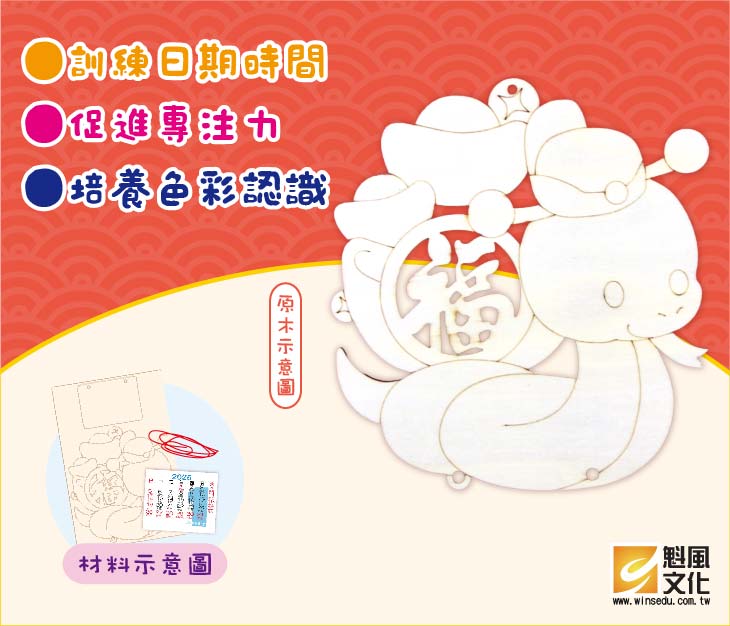 尺寸:主體約14x22cm 內容:木片、小月曆、塑膠扣環、線 / 彩繪 上色建議: 幼兒園:彩虹筆、油性蠟筆。彩色筆也可以,但效果沒那麼漂亮及細膩。 小學:水彩、廣告顏料、壓克力顏料,少量加水顏色更飽和、更漂亮。