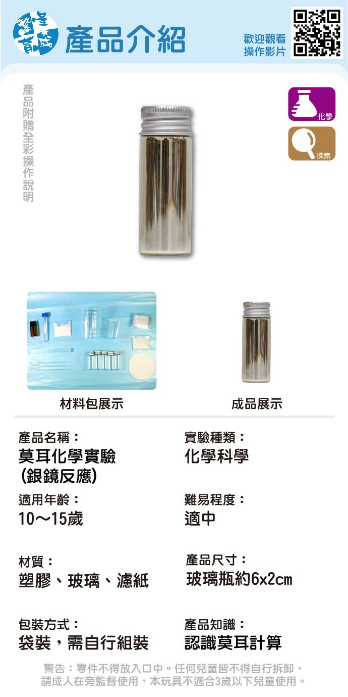 莫耳銀鏡化學實驗 產品編號:K0016-9 原價 500 375 ✦ 知識目標 1. 認識化學濃度的意義與計算方式。 2. 理解銀鏡反應的化學原理與應用。 3. 學會實驗後廢液回收的重要性與正確方法。 ✦ 素養目標 1. 透過動手實作,享受以成品來表現自己構想的樂趣。 2. 透過探討自然與物質世界的規律性,感受發現的樂趣。 課程建議時間:90分鐘 適用年齡:8-15歲 規格 組 -- 375元 數量 - + 加入購物車 立即結帳 回到列表 下一筆