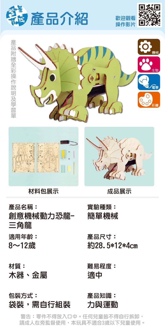 創意機械動力恐龍-三角龍 產品編號:KS01239-3 原價 270 203 ✦ 知識目標 1. 了解機械動力原理與應用。 2. 完成創意機械動力恐龍。 ✦ 素養目標 1. 透過動手實作,享受以成品來表現自己構想的樂趣。 2. 引導學童享受學習主動探究自然科學的樂趣。 課程建議時間:90分鐘 適用年齡:8-15歲 規格 組 -- 203元 數量 - + 加入購物車 立即結帳 上一筆 回到列表 下一筆