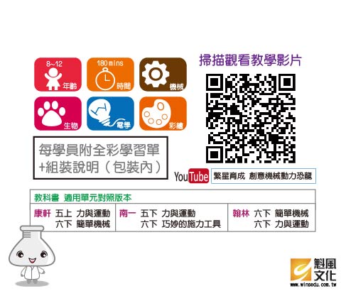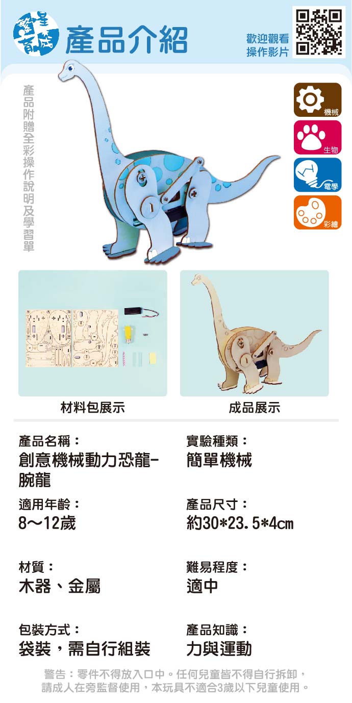 創意機械動力恐龍-腕龍 產品編號:KS01239-4 原價 270 203 ✦ 知識目標 1. 了解機械動力原理與應用。 2. 完成創意機械動力恐龍。 ✦ 素養目標 1. 透過動手實作,享受以成品來表現自己構想的樂趣。 2. 引導學童享受學習主動探究自然科學的樂趣。 課程建議時間:90分鐘 適用年齡:8-15歲 規格 組 -- 203元 數量 - + 加入購物車 立即結帳 上一筆 回到列表 下一筆