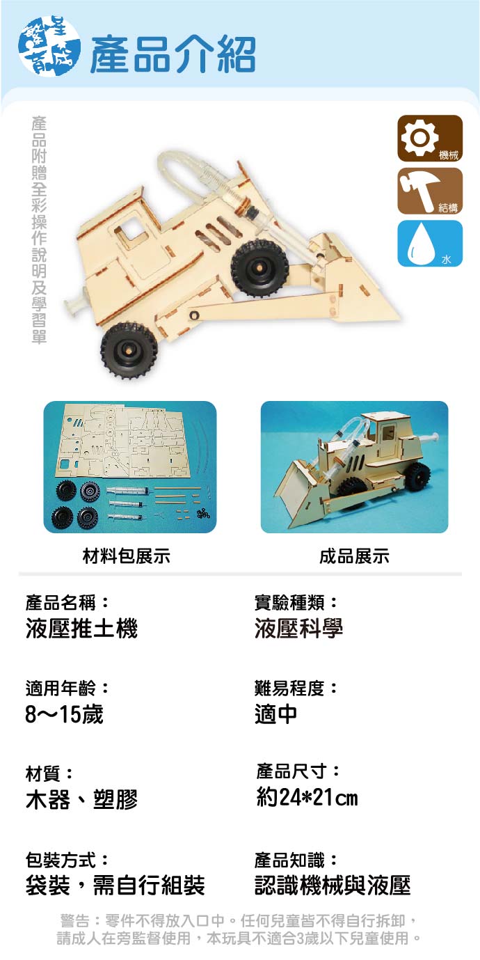 液壓推土機 產品編號:KS013-1 原價 360 270 ✦ 知識目標 1. 了解液體特性,及液壓系統的應用。 2. 認識帕斯卡原理。 ✦ 素養目標 1. 透過科學探索了解現象發生的原因或機制,滿足好奇心。 2. 透過動手實作,享受以成品來表現自己構想的樂趣。 課程建議時間:90分鐘 適用年齡:10-15歲 規格 組 -- 270元 數量 - + 加入購物車 立即結帳 上一筆 回到列表 下一筆