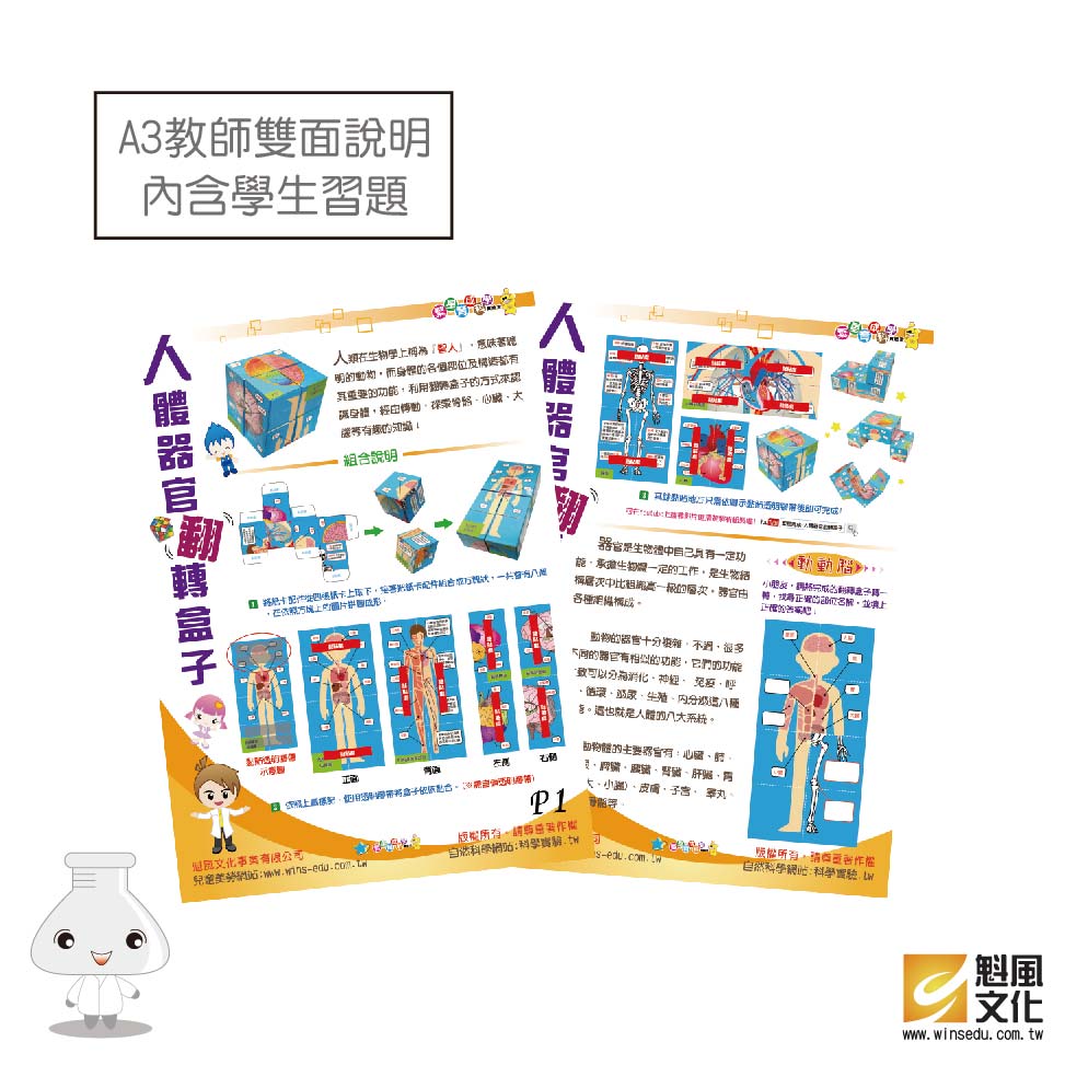 人體器官翻轉盒子(英文版) 產品編號:K004-551 原價 90 68 ✦ 知識目標 1. 認識人體內的重要器官並了解其功能。 2. 了解人體內的系統組成,並知道系統對生命的作用性。 ✦ 素養目標 1. 能運用五官,敏銳的觀察周遭環境,保持好奇心、想像力持續探索自然。 2. 透過科學探究活動,了解科學知識的基礎是來自於真實的經驗和證據。 課程建議時間:90分鐘 適用年齡:8-15歲 規格 組 -- 68元 數量 - + 加入購物車 立即結帳 上一筆 回到列表 下一筆