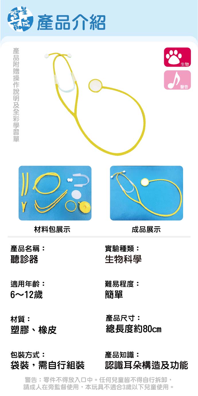 聽診器 產品編號:K004-53 原價 100 75 ✦ 知識目標 1. 了解耳朵的結構與功能。 2. 認識聽診器的作用與結構。 ✦ 素養目標 1. 能簡單分辨或分類所觀察到的自然科學現象。 2. 利用科學知識理解日常生活觀察到的現象。 課程建議時間:90分鐘 適用年齡:6-12歲 規格 組 -- 75元 數量 - + 加入購物車 立即結帳 上一筆 回到列表 下一筆