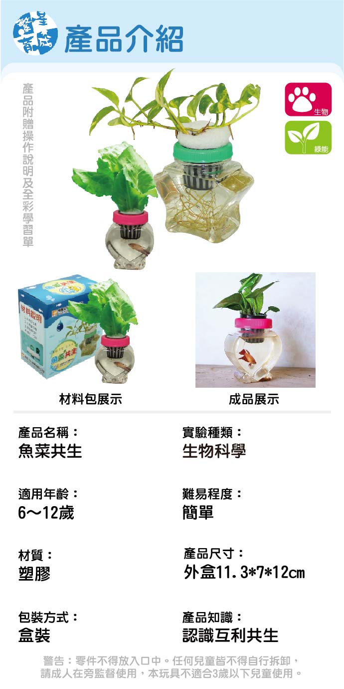 魚菜共生 產品編號:K0016-1 原價 150 113 ✦ 知識目標 1. 認識魚菜共生的優點及其循環原理。 2. 實際操作體驗養殖與種植的要點。 ✦ 素養目標 1. 透過探討自然與物質世界的規律性,感受發現的樂趣。 課程建議時間:90分鐘 適用年齡:6-12歲 規格 組 -- 113元 數量 - + 加入購物車 立即結帳 上一筆 回到列表 下一筆