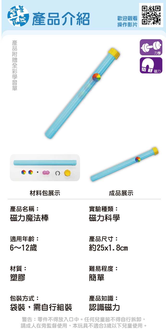 磁力魔法棒 產品編號:K004-36 原價 100 75 ✦ 知識目標 1. 認識磁力特性。 2. 了解浮力原理。 ✦ 素養目標 1. 保持對自然現象的好奇心,透過不斷的探尋和提問,常會有新發現。 2. 透過成功的科學探索經驗,感受自然科學學習的樂趣。 課程建議時間:90分鐘 適用年齡:8-12歲 規格 組 -- 75元 數量 - + 加入購物車 立即結帳 上一筆 回到列表 下一筆