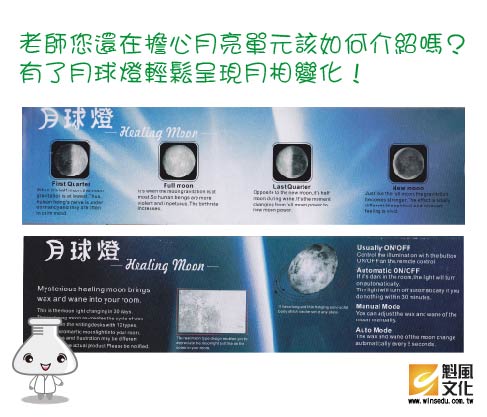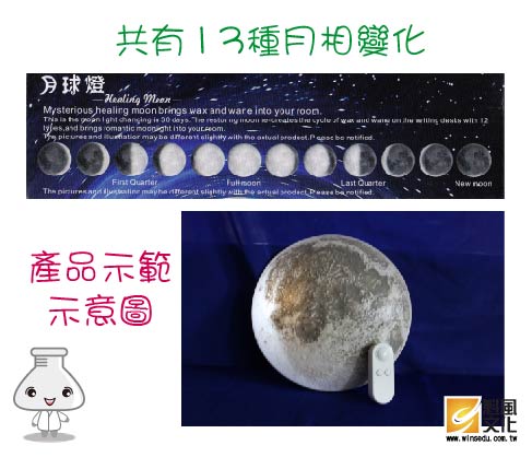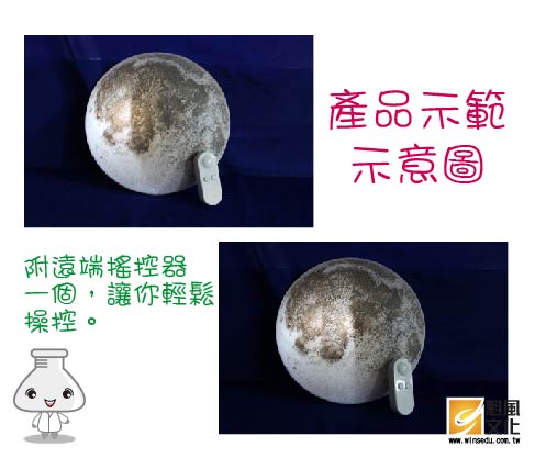 ⭐⭐⭐月球燈的操作如下: 1. 月球燈本身需要裝上電池,然後打開開關,一開始的時候會先緩慢亮起。模擬月亮的週期,才會慢慢變成滿月的狀態。 2. 遙控器也需要裝上電池。在滿月的情況下,按下通用按鈕可以調整燈的開與關。按下自動按鈕則會自動從頭開始亮起。手動的部分則是自行控制月亮燈狀態。 需要注意的部分是在月亮燈底下有個光敏電阻,當光敏電阻照光的時候,會讓月亮燈因為電阻大而關閉,這時候需要重新啟動。如果還是不亮,可以用手遮蔽光敏電阻即可啟動。