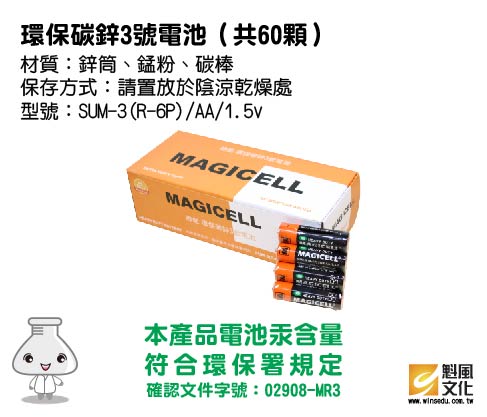 碳鋅3號電池60顆 產品編號:KA0013-2 原價 0 環保碳鋅3號電池(共60顆) 材質:鋅筒、錳粉、碳棒 保存方式:請置放於陰涼乾燥處 型號:SUM-3(R-6P)/AA/1.5v 本產品電池汞含量符合環保署規定 確認文件字號:02908-MR3 規格 產品已售完,補貨中 數量 上一筆 回到列表