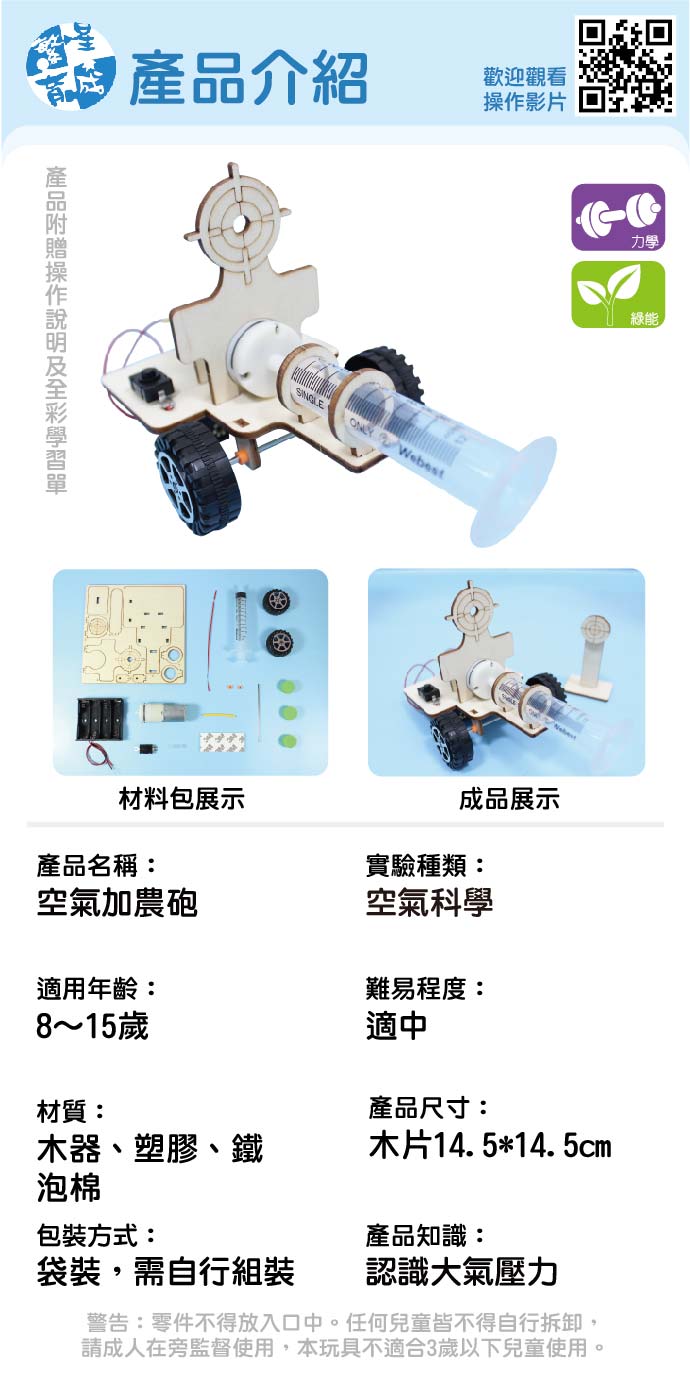 空氣加農砲 產品編號:KS01259 原價 240 180 ✦ 知識目標 1. 認識空氣特性及大氣壓力。 2. 應用氣壓完成加農砲製作。 ✦ 素養目標 1. 透過成功的科學探索經驗,感受自然科學學習的樂趣。 2. 透過動手實作,享受以成品來表現自己構想的樂趣。 課程建議時間:90分鐘 適用年齡:8-12歲 規格 組 -- 180元 數量 - + 加入購物車 立即結帳 上一筆 回到列表 下一筆