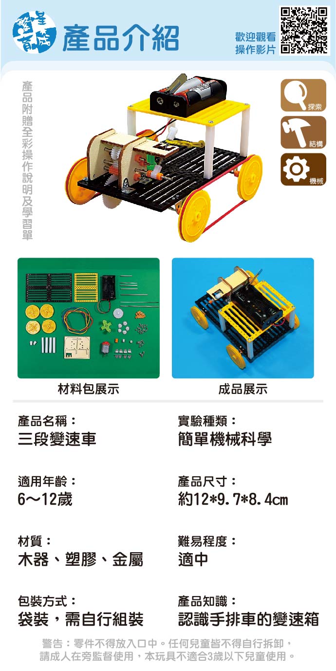 三段變速車 產品編號:K005-24 原價 160 120 ✦ 知識目標 1. 探究汽車變速箱中的奧秘。 2. 認識三段變速車的功能。 ✦ 素養目標 透過動手實作,享受以成品來表現自己構想的樂趣。 課程建議時間:90分鐘 適用年齡:8-12歲 規格 組 -- 120元 數量 - + 加入購物車 立即結帳 上一筆 回到列表 下一筆