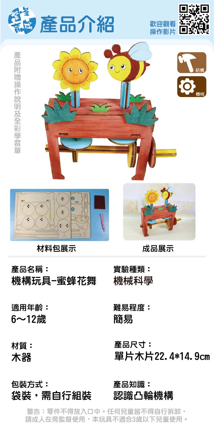 蜜蜂花舞 產品編號:KS01271 原價 120 90 ✦ 知識目標 1. 認識凸輪機構。 2. 認識曲柄結構。 ✦ 素養目標 1. 能應用科學知識、方法與態度於日常生活當中。 2. 透過動手實作,享受以成品來表現自己構想的樂趣。 課程建議時間:90分鐘 適用年齡:8-15歲 規格 組 -- 90元 數量 - + 加入購物車 立即結帳 上一筆 回到列表 下一筆