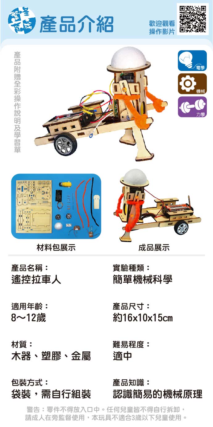 遙控拉車人 產品編號:KS01233-1 原價 300 225 ✦ 知識目標 1. 了解齒輪箱的功能與應用。 2. 認識遙控原理。 ✦ 素養目標 利用科學知識理解日常生活觀察到的現象。 課程建議時間:90分鐘 適用年齡:8-15歲 規格 組 -- 225元 數量 - + 加入購物車 立即結帳 上一筆 回到列表 下一筆