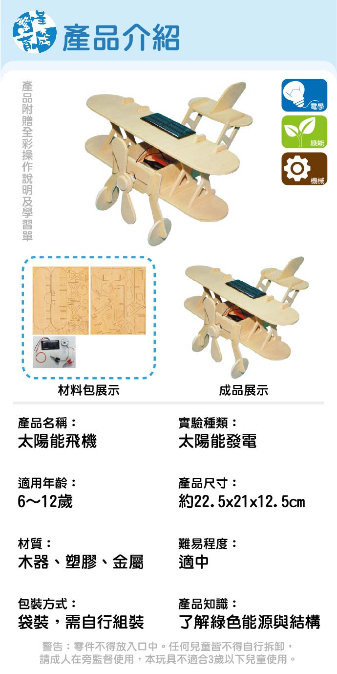太陽能飛機 產品編號:KS004 原價 240 180 ✦ 知識目標 認識太陽能的優缺點及應用。 ✦ 素養目標 透過動手實作,享受以成品來表現自己構想的樂趣。 課程建議時間:90分鐘 適用年齡:6-12歲 規格 組 -- 180元 數量 - + 加入購物車 立即結帳 上一筆 回到列表 下一筆