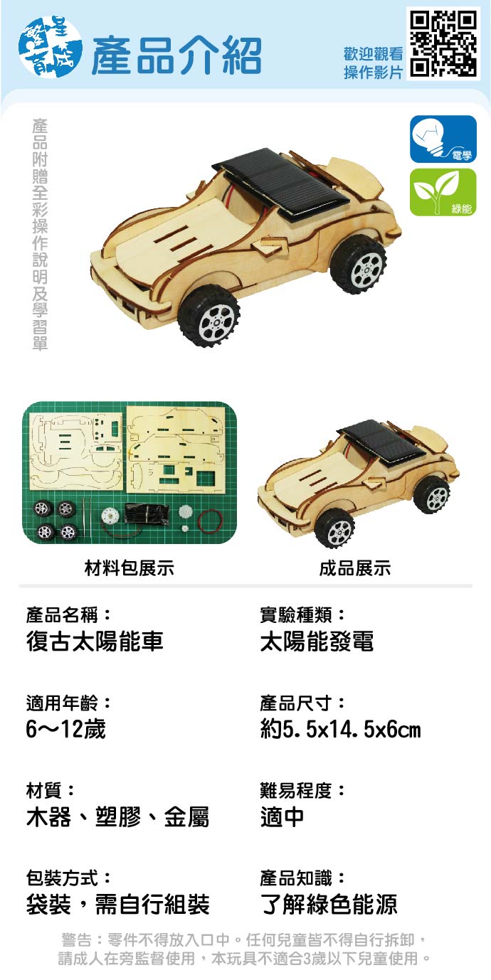復古太陽能車 產品編號:KS01212 原價 240 180 ✦ 知識目標 認識太陽能的應用及其優缺點。 ✦ 素養目標 能運用五官,敏銳的觀察周遭環境,保持好奇心、想像力持續探索自然。 課程建議時間:90分鐘 適用年齡:6-12歲 規格 組 -- 180元 數量 - + 加入購物車 立即結帳 上一筆 回到列表 下一筆