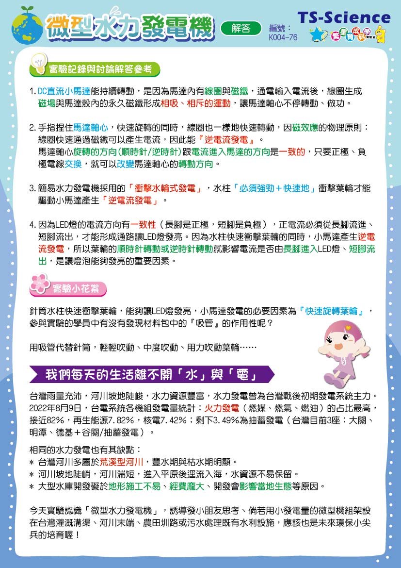 微型水力發電機 產品編號:K004-76 原價 120 90 ✦ 知識目標 認識水力發電的原理及應用。 ✦ 素養目標 理解科學的進展與對人類社會的貢獻及限制。 課程建議時間:90分鐘適用年齡:6-12歲 規格 組 -- 90元 數量 - + 加入購物車 立即結帳 上一筆 回到列表 下一筆