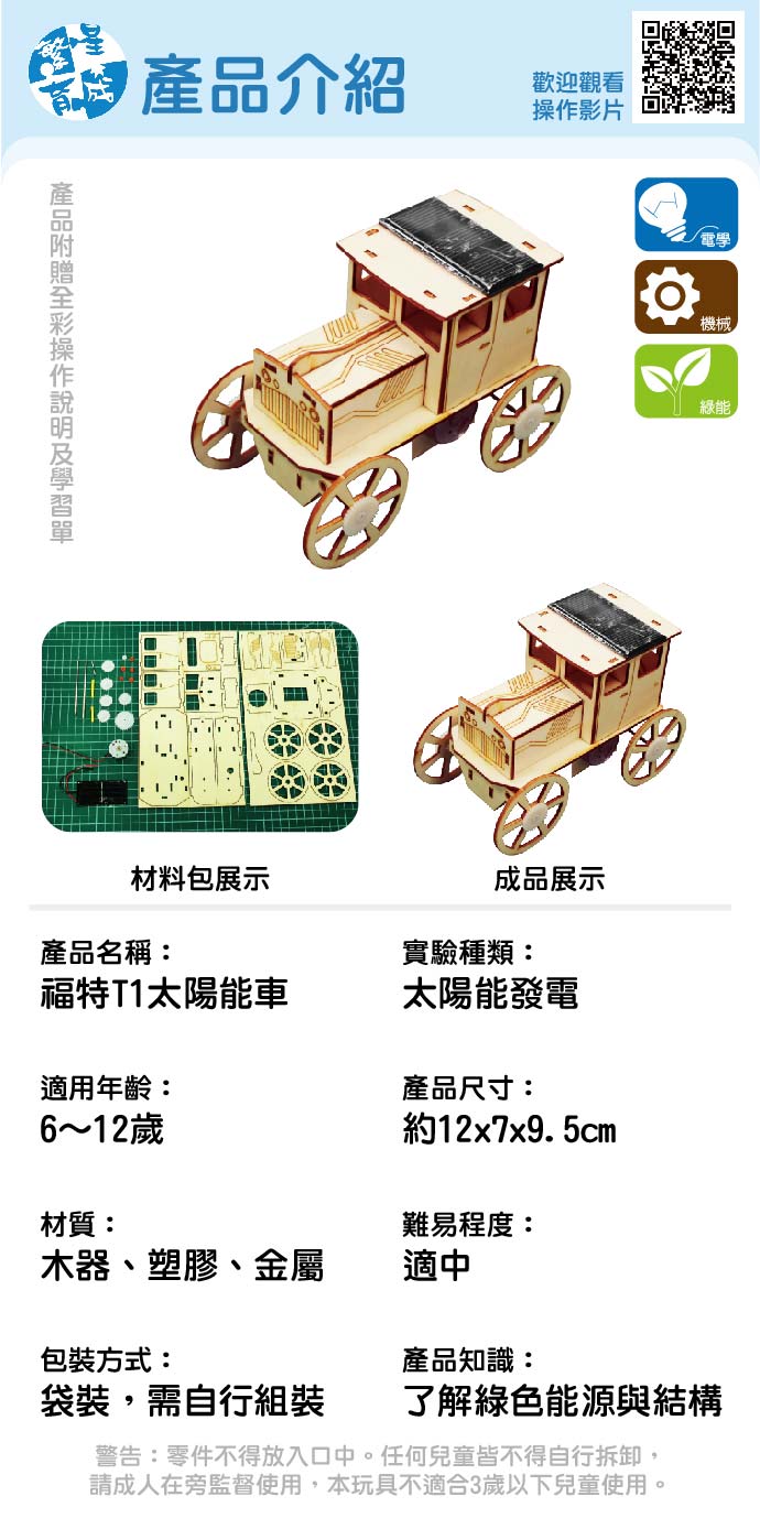 福特T1太陽能車 產品編號:KS1207 原價 260 195 ✦ 知識目標 1. 認識太陽能的應用及其優缺點。 2. 完成福特T1太陽能車的製作。 ✦ 素養目標 透過動手實作,享受以成品來表現自己構想的樂趣。 課程建議時間:90分鐘 適用年齡:6-12歲 規格 組 -- 195元 數量 - + 加入購物車 立即結帳 上一筆 回到列表 下一筆