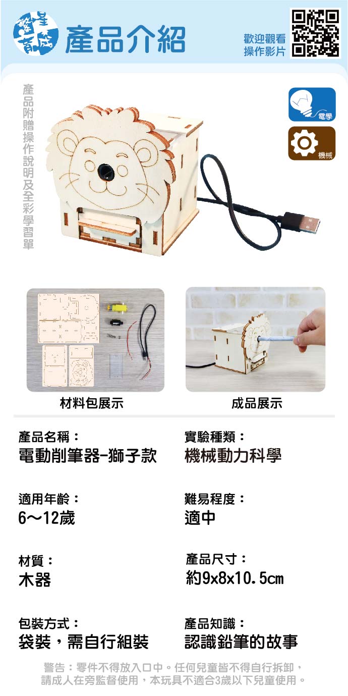 電動削筆器-獅子款 產品編號:KS01279 原價 240 180 ✦ 知識目標 1. 認識鉛筆的故事 2. 了解鉛筆的編號意義 ✦ 素養目標 1. 透過科學探究活動解決一部分生活週遭的問題。 2. 透過動手實作,享受以成品來表現自己構想的樂趣。 課程建議時間:90分鐘 適用年齡:8-15歲 規格 組 -- 180元 數量 - + 加入購物車 立即結帳 回到列表 下一筆