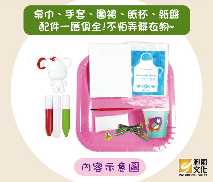 內容:熊、蝴蝶結、鈴鐺、顏料、畫筆、燈泡扣、紙杯、紙盤、桌巾、手套、圍裙
