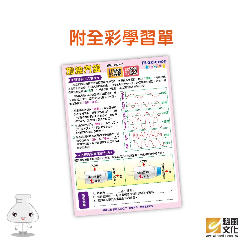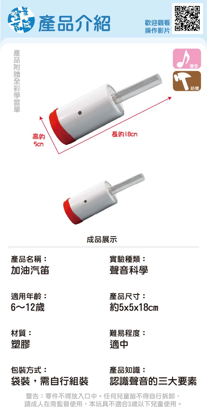 加油汽笛 產品編號:K004-20 原價 80 60 ✦ 知識目標 1. 了解聲音產生的原理。 2. 認識聲音的三要素。 ✦ 素養目標 1. 保持對自然現象的好奇心,透過不斷的探尋和提問,常會有新發現。 2. 發覺創造和想像是科學的重要元素。 課程建議時間:90分鐘 適用年齡:8-12歲 規格 組 -- 60元 數量 - + 加入購物車 立即結帳 上一筆 回到列表 下一筆