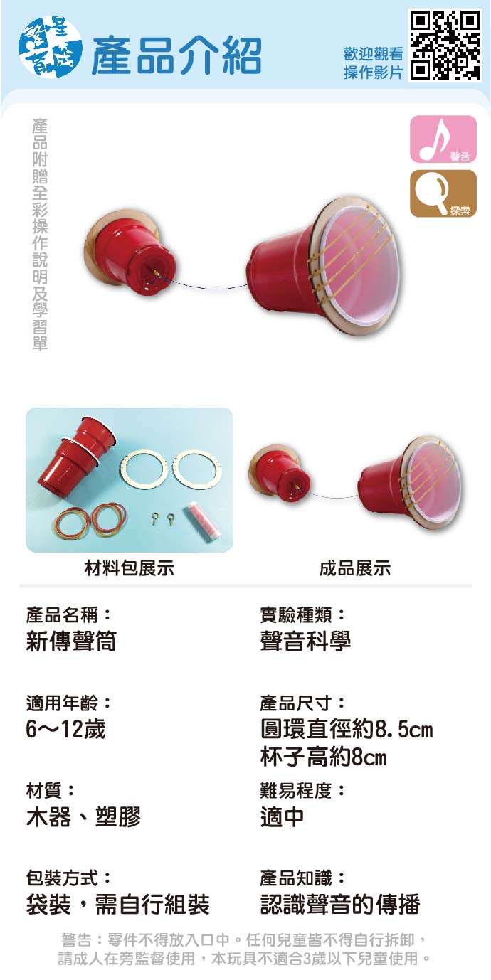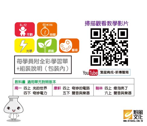 新傳聲筒 產品編號:K004-73 原價 80 60 ✦ 知識目標 1. 認識聲音的特性。 2. 了解響度、音頻、音色的差別。 ✦ 素養目標 1. 保持對自然現象的好奇心,透過不斷的探尋和提問,常會有新發現。 2. 能簡單分辨或分類所觀察到的自然科學現象。 課程建議時間:90分鐘 適用年齡:8-12歲 規格 組 -- 60元 數量 - + 加入購物車 立即結帳 上一筆 回到列表