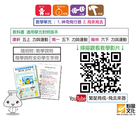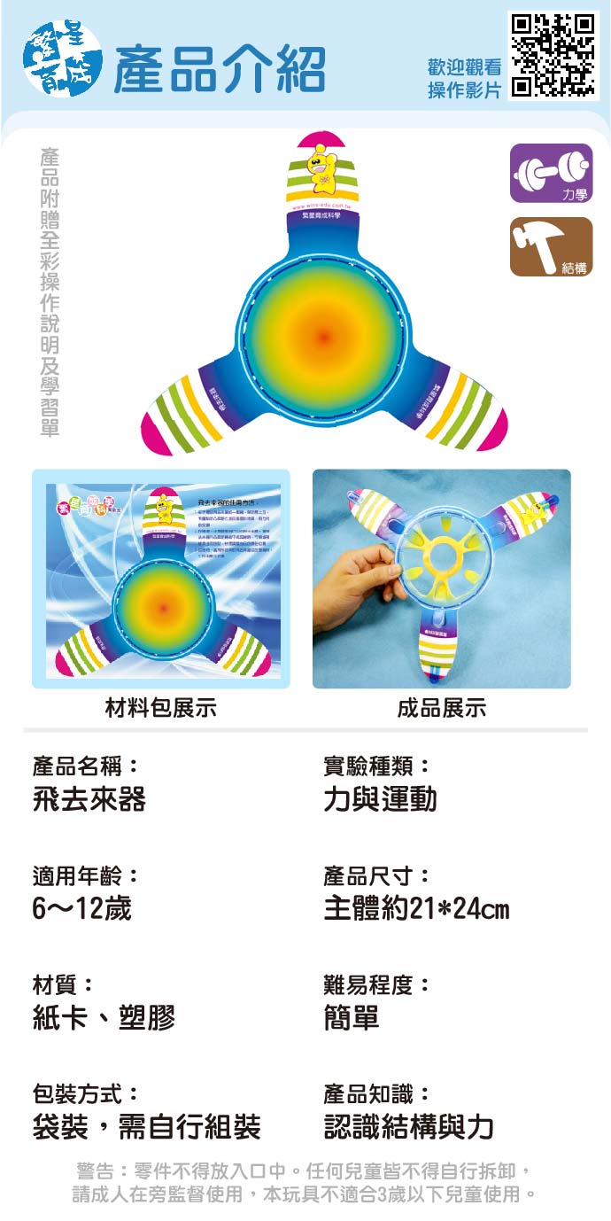 飛去來器 產品編號:K004-14 原價 80 60 ✦ 知識目標 1. 了解空氣氣流在飛行時的作用。 ✦ 素養目標 1. 透過科學探索了解現象發生的原因或機制,滿足好奇心。 課程建議時間:90分鐘 適用年齡:6-12歲 規格 組 -- 60元 數量 - + 加入購物車 立即結帳 上一筆 回到列表 下一筆