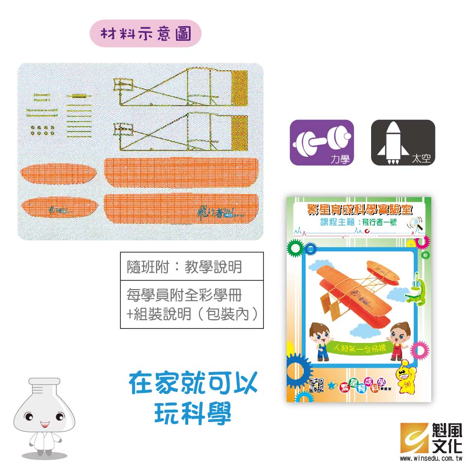 飛行者一號 產品編號:K0042-1 原價 160 120 ✦ 知識目標 1. 了解飛行歷史。 2. 認識飛機結構與功能。 ✦ 素養目標 1. 透過科學探究活動,了解科學知識的基礎是來自於真實的經驗和證據。 課程建議時間:90分鐘 適用年齡:8-12歲 規格 組 -- 120元 數量 - + 加入購物車 立即結帳 上一筆 回到列表 下一筆