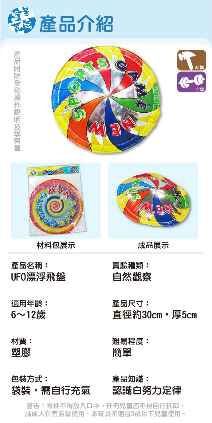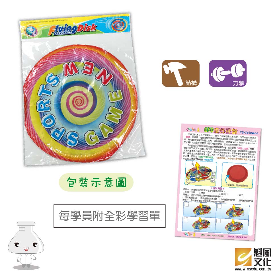 UFO漂浮飛盤 產品編號:KC-009 原價 70 53 ✦ 知識目標 1. 認識飛盤的歷史。 2. 認識白努力定律。 ✦ 素養目標 1. 保持對自然現象的好奇心,透過不斷的探尋和提問,常會有新發現。 2. 利用科學知識理解日常生活觀察到的現象。 課程建議時間:90分鐘 適用年齡:6-12歲 規格 組 -- 53元 數量 - + 加入購物車 立即結帳 上一筆 回到列表 下一筆