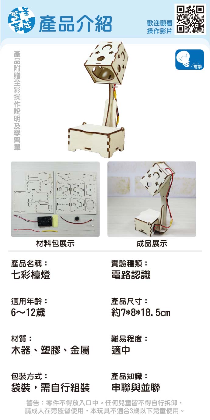 七彩檯燈 產品編號:KS01250 原價 120 90 ✦ 知識目標 1. 通過對電路連接實驗的探究,增加電路串聯並聯的深度了解。 ✦ 素養目標 1. 透過探討自然與物質世界的規律性,感受發現的樂趣。 2. 透過科學探究活動解決一部分生活週遭的問題。 課程建議時間:90分鐘 適用年齡:8-12歲 規格 組 -- 90元 數量 - + 加入購物車 立即結帳 上一筆 回到列表 下一筆