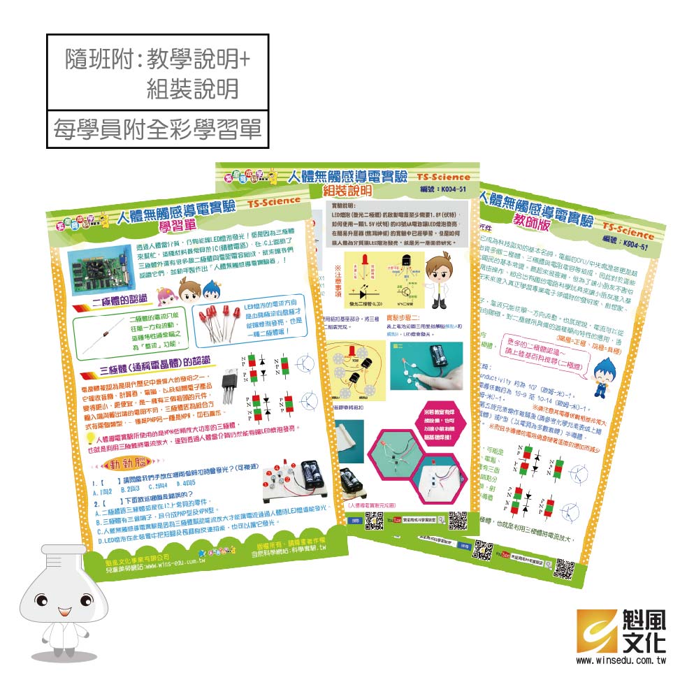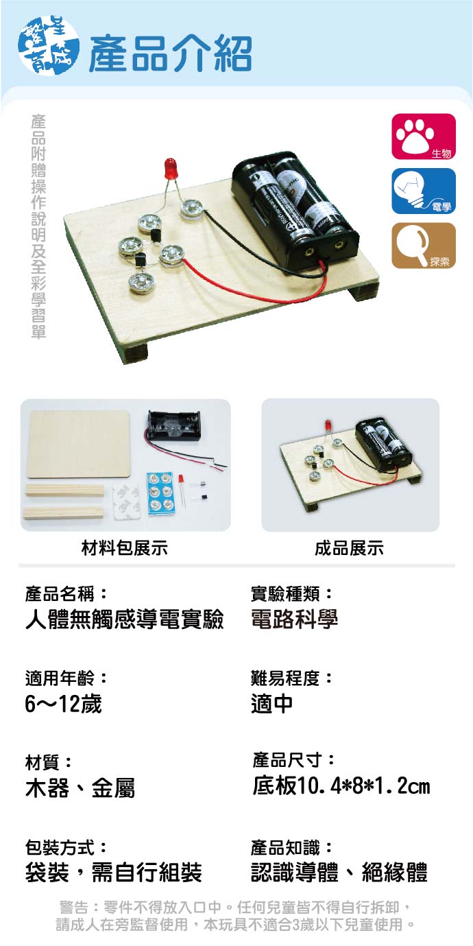 人體無觸感導電實驗 產品編號:K004-51 原價 100 75 ✦ 知識目標 1. 認識生活中的電子元件:發光二極體、三極體。 2. 認識物質的導電性。 ✦ 素養目標 1. 透過科學探究活動解決一部分生活週遭的問題。 2. 利用科學知識理解日常生活觀察到的現象。 課程建議時間:90分鐘 適用年齡:8-12歲 規格 組 -- 75元 數量 - + 加入購物車 立即結帳 上一筆 回到列表 下一筆