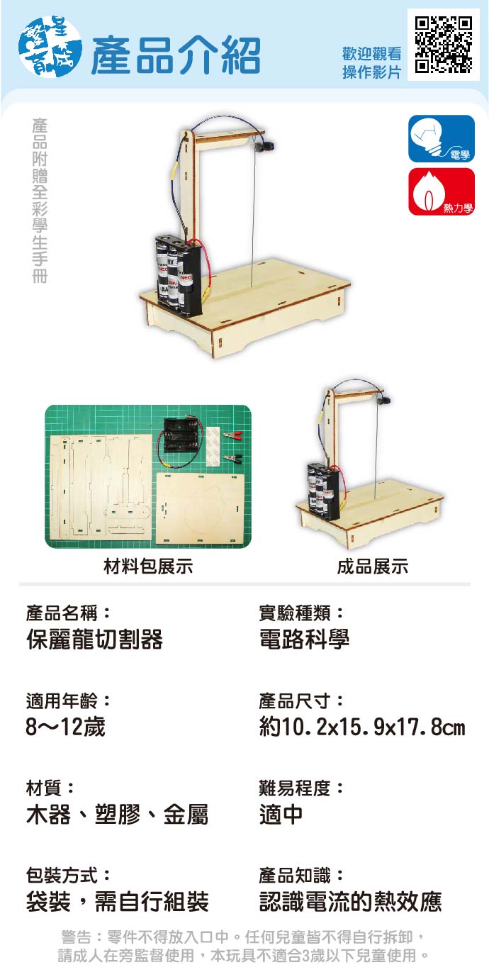 保麗龍切割器 產品編號:KL005 原價 120 90 ✦ 知識目標 1. 認識保麗龍。 2. 了解電流熱效應的原理及應用。 ✦ 素養目標 1. 利用科學知識理解日常生活觀察到的現象。 2. 引導學童享受學習主動探究自然科學的樂趣。 課程建議時間:90分鐘 適用年齡:8-12歲 規格 組 -- 90元 數量 - + 加入購物車 立即結帳 上一筆 回到列表 下一筆