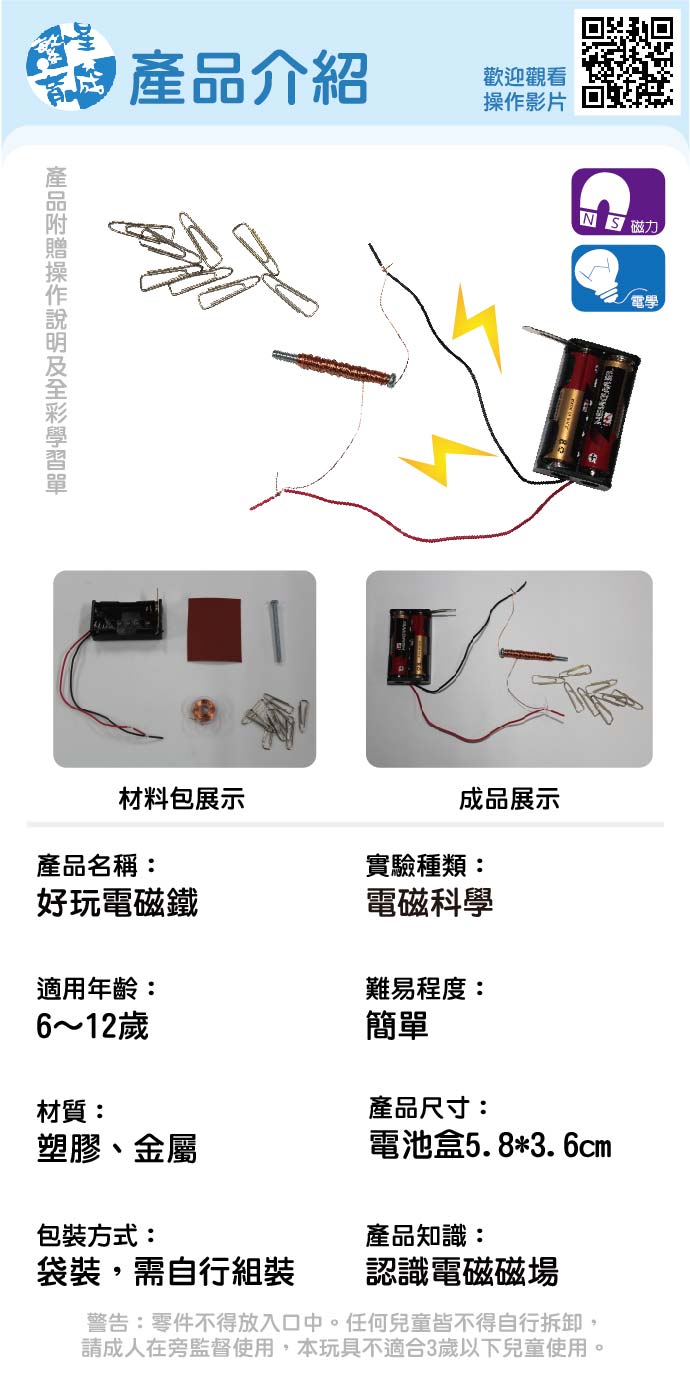 好玩電磁鐵 產品編號:K004-46 原價 80 60 ✦ 知識目標 1. 認識磁鐵特性。 2. 應用電路知識製作電磁鐵。 ✦ 素養目標 1. 透過科學探究活動解決一部分生活週遭的問題。 2. 能應用科學知識、方法與態度於日常生活當中。 課程建議時間:90分鐘 適用年齡:8-12歲 規格 組 -- 60元 數量 - + 加入購物車 立即結帳 上一筆 回到列表 下一筆