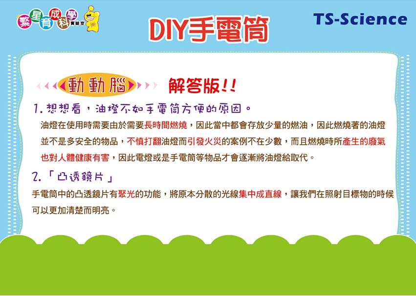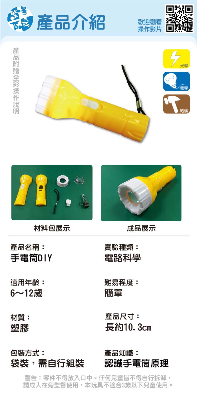 手電筒diy 產品編號:K004-50 原價 70 53 ✦ 知識目標 1. 認識手電筒的歷史起源。 2. 了解簡單電路。 ✦ 素養目標 1. 能應用科學知識、方法與態度於日常生活當中。 2. 透過成功的科學探索經驗,感受自然科學學習的樂趣。 課程建議時間:90分鐘 適用年齡:6-12歲 規格 組 -- 53元 數量 - + 加入購物車 立即結帳 上一筆 回到列表 下一筆