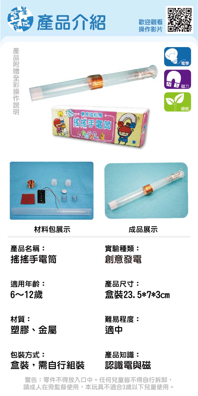 搖搖手電筒 產品編號:K005-6 原價 150 113 ✦ 知識目標 1. 了解電生磁的科學原理,並了解電生磁在生活中的應用與發展歷史。 2. 獨立完成搖搖手電筒的製作,並能說出感應發電的原理。 ✦ 素養目標 1. 能利用簡單形式的口語、文字或圖畫等,表達探究之過程、發現。 2. 能正確安全操作適合學習階段的物品、器材儀器、科技設備及資源,並能觀察和記錄。 課程建議時間:90分鐘 適用年齡:8-12歲 規格 組 -- 113元 數量 - + 加入購物車 立即結帳 上一筆 回到列表 下一筆
