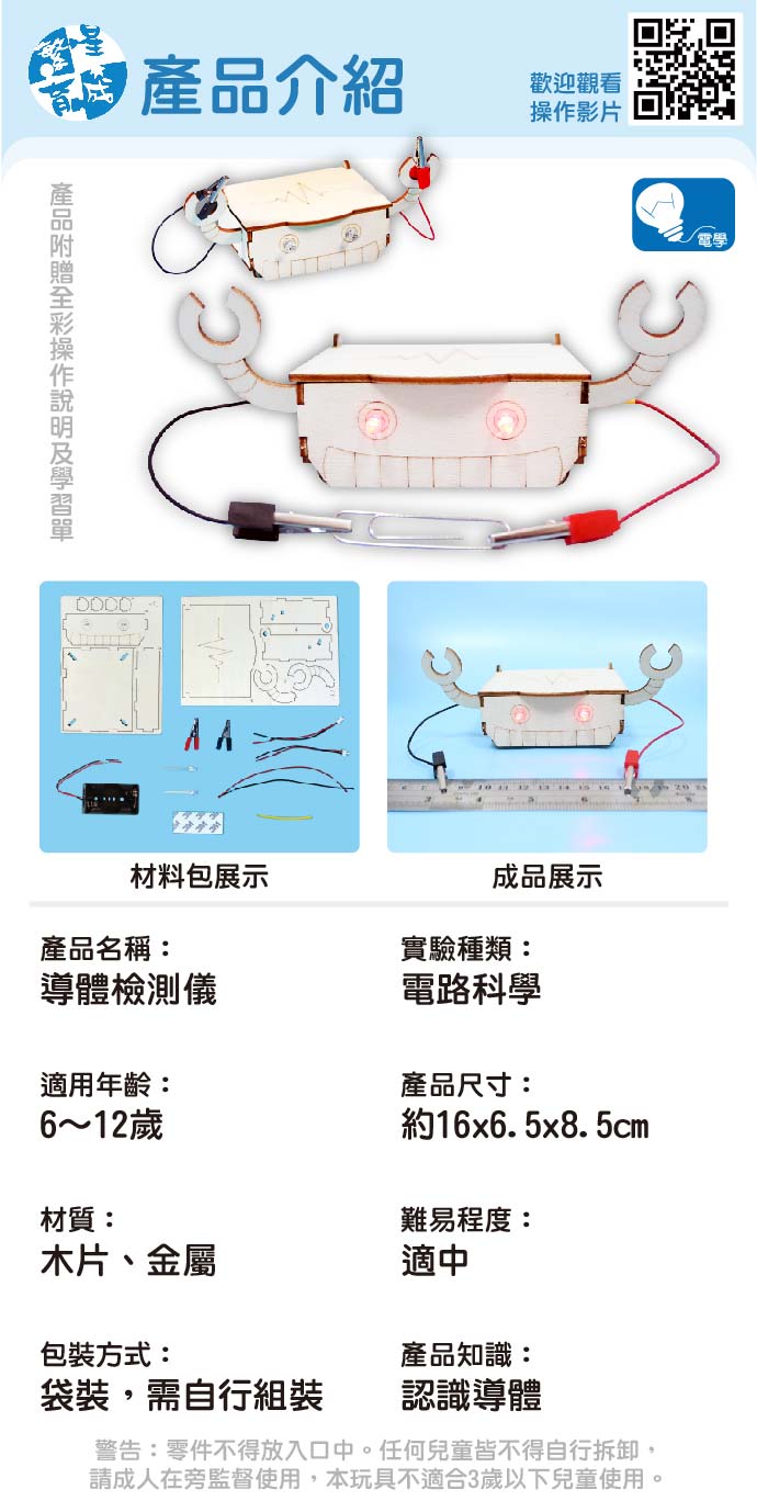 機器人導體檢測儀 產品編號:KS01258 原價 100 75 ✦ 知識目標 1. 了解導體與不良導體的不同,並學會分辨。 2. 認識簡單電路。 ✦ 素養目標 1. 透過科學探究活動,了解科學知識的基礎是來自於真實的經驗和證據。 2. 透過成功的科學探索經驗,感受自然科學學習的樂趣。 課程建議時間:90分鐘 適用年齡:8-12歲 規格 組 -- 75元 數量 - + 加入購物車 立即結帳 上一筆 回到列表 下一筆