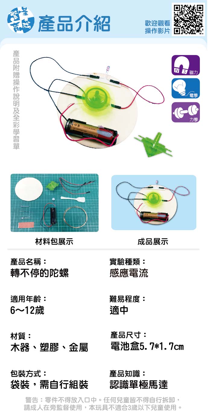 轉不停的陀螺 產品編號:K004-56 原價 100 75 ✦ 知識目標 1. 了解電磁感應定律。 2. 應用磁鐵特性製作轉不停的陀螺。 ✦ 素養目標 1. 透過探討自然與物質世界的規律性,感受發現的樂趣。 2. 透過科學探索了解現象發生的原因或機制,滿足好奇心。 課程建議時間:90分鐘 適用年齡:10-15歲 規格 組 -- 75元 數量 - + 加入購物車 立即結帳 上一筆 回到列表 下一筆
