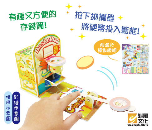按下拋擲器!將硬幣投入籃框~ 好玩又實用的硬幣投籃機 讓存錢的過程變得更加有趣! 珍珠板上裱圖畫紙,上色更方便! 適合 幼兒園//小學DIY手作美勞 繽紛的色彩、實用的功能、讓手作充滿樂趣! 【關聯產品】 ➤珍珠板彈珠台 ➤珍珠板釣魚遊戲