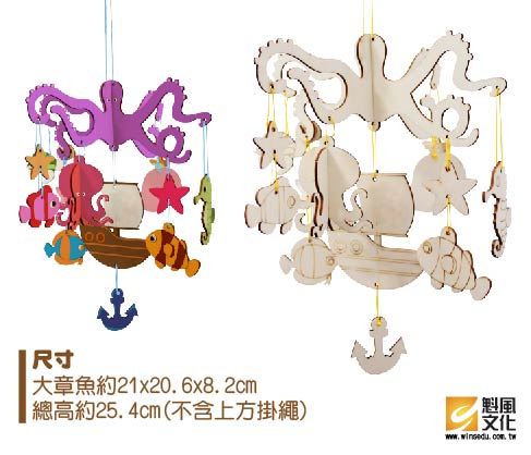 尺寸:章魚主體約長20.6x寬21x高4cm,總高約24cm(不含上方掛繩) 上色建議: 幼兒園: 彩虹筆、油性蠟筆。彩色筆也可以, 但效果沒麼漂亮及細膩。 小 學: 水彩、廣告顏料、壓克力顏料, 少量加水顏色更飽和、更漂亮。