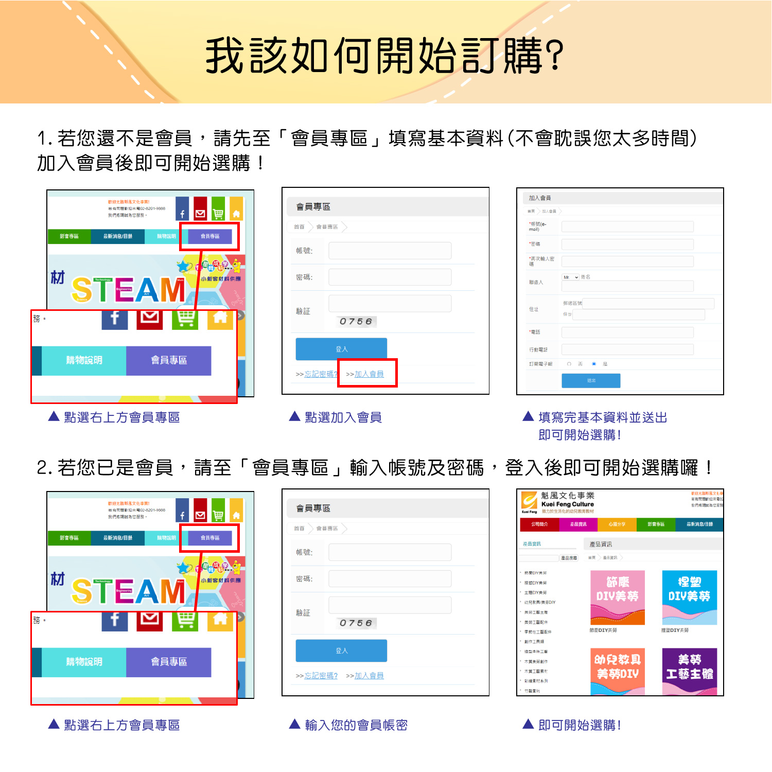1.若您還不是會員,請先至「會員專區」填寫基本資料(不會耽誤您太多時間)加入會員後即可開始選購!